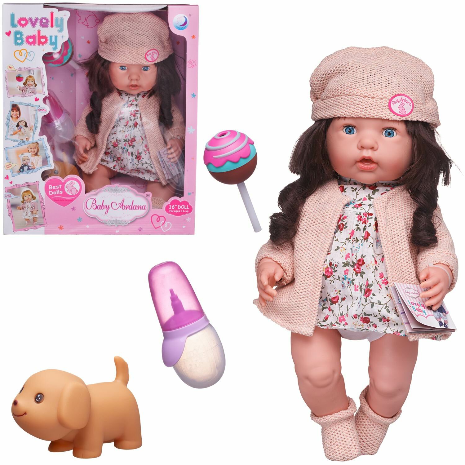 Пупс-кукла "Baby Ardana", 40см, в платье и вязаном пальто, в наборе с аксессуарами, в коробке