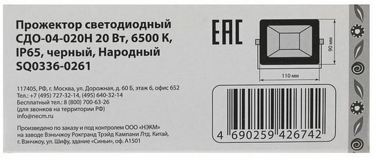 Прожектор светодиодный TDM SQ0336-0261 Сдо-04-020н 20 Вт, 6500 К, Ip65, черный, Народный SQ0336-0261 .