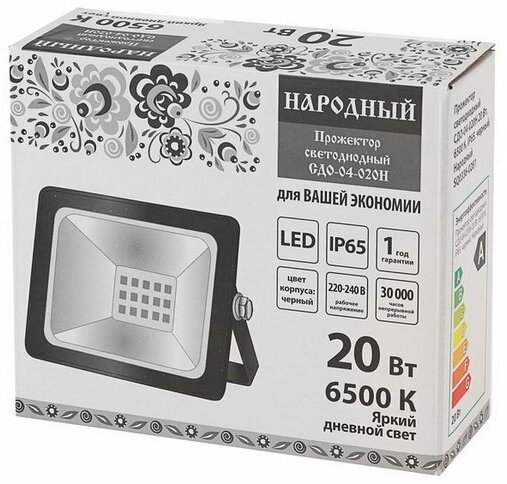 Прожектор светодиодный Народный СДО-04-020Н, 20 Вт, 6500 К, IP65, черный