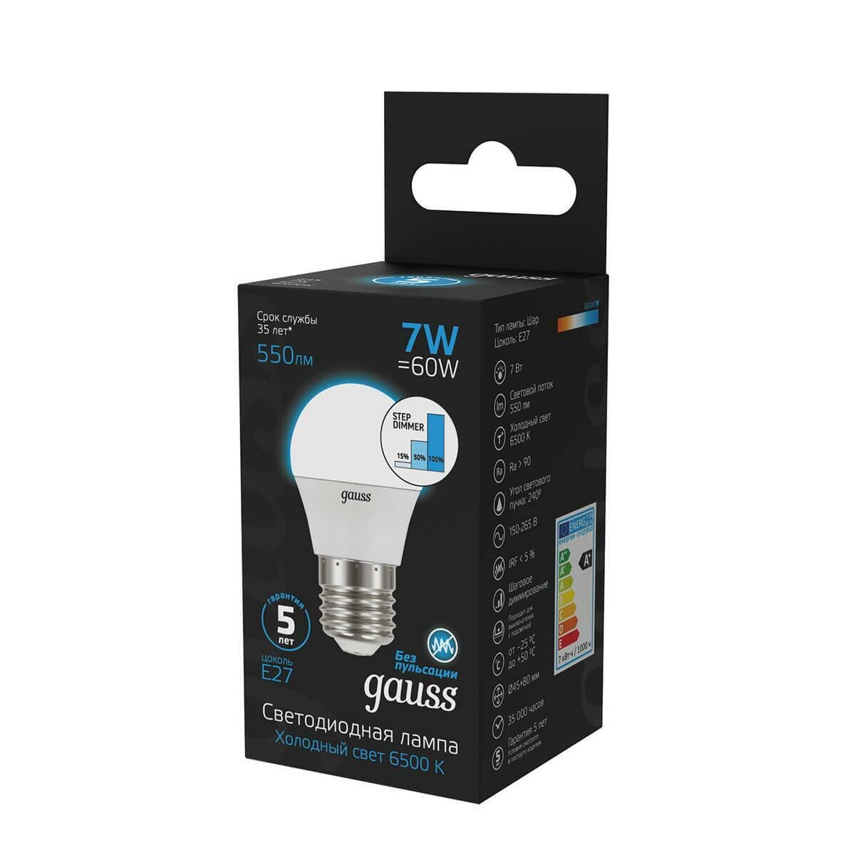Светодиодная лампа Gauss "Шар" 7Вт 550Лм Е27 6500К Шаговое диммирование