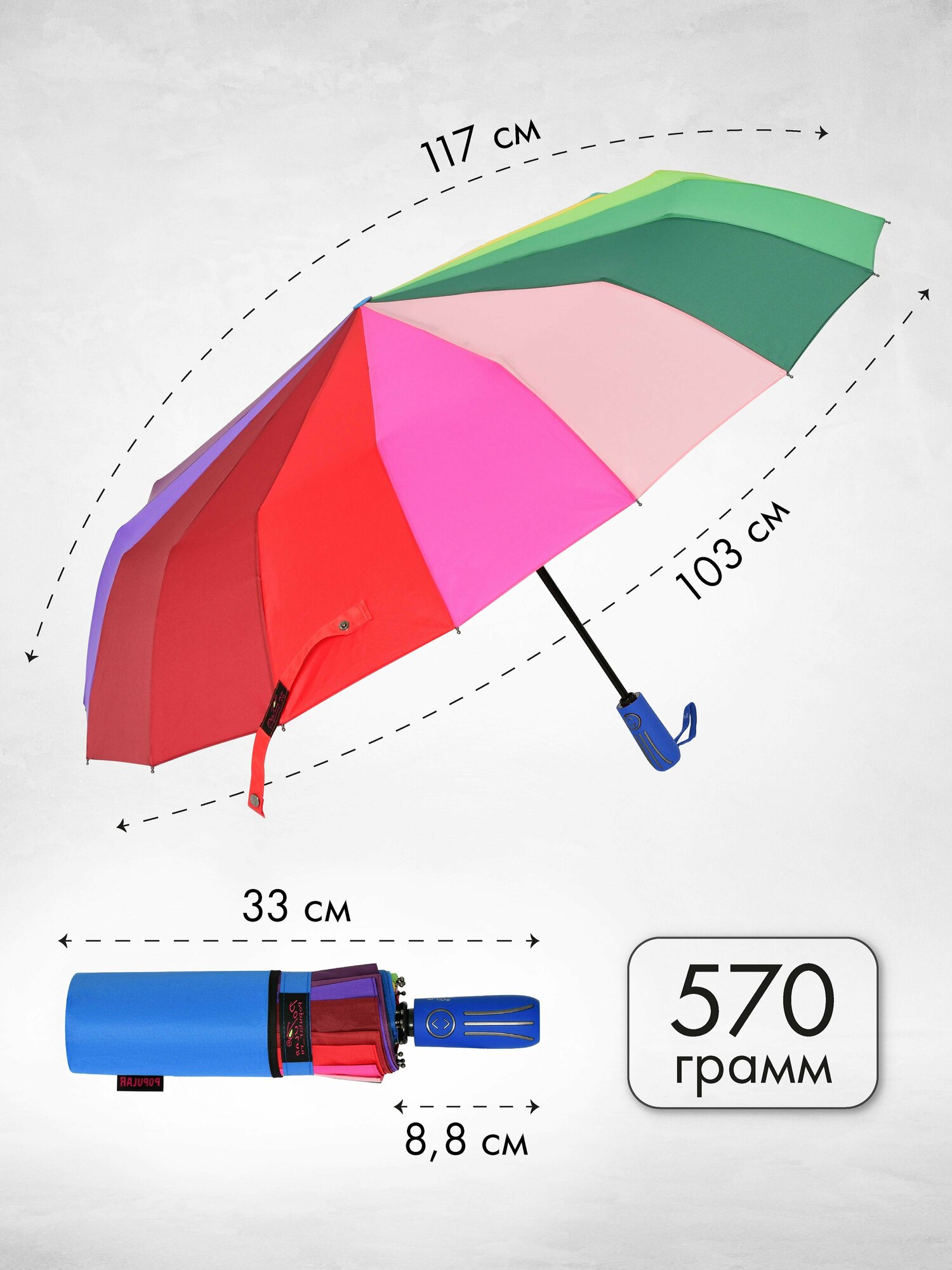 | Плюсы: | Большой купол, не только голову прикрывает. Крепкие спицы. Яркий дизайн — для промозглого дождливого дня в каком-нибудь ноябре самое то. |