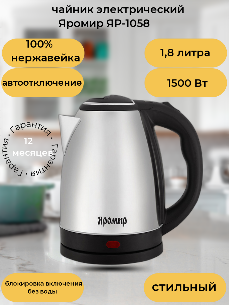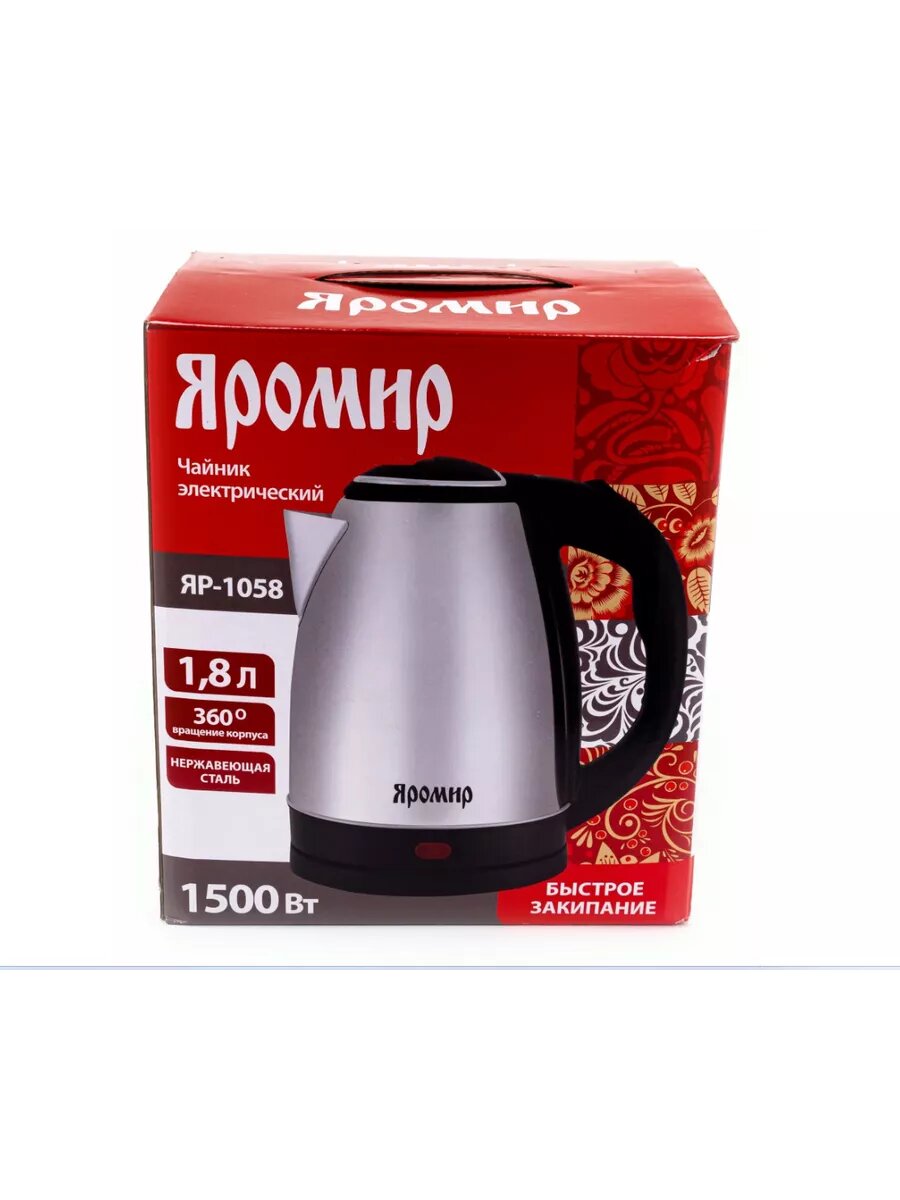Чайник электрисеский яромир ЯР-1058 1,8л, 1500 Вт, нержавеющая сталь