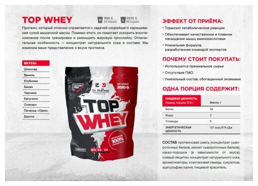 Протеин сывороточный Доктор Хоффман / клубника / Top Whey Protein Dr. Hoffman / 908 гр