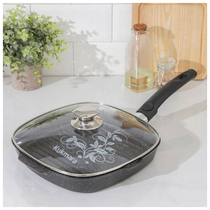 KUKMARA Сковорода-гриль Granit ultra, 26х26 см, съёмная ручка, стеклянная крышка, антипригарное покрытие, цвет чёрный