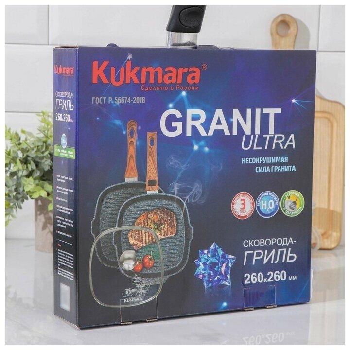 Сковорода-гриль Kukmara "Granit ultra", 26х26 см, антипригарная, съемная ручка, с крышкой