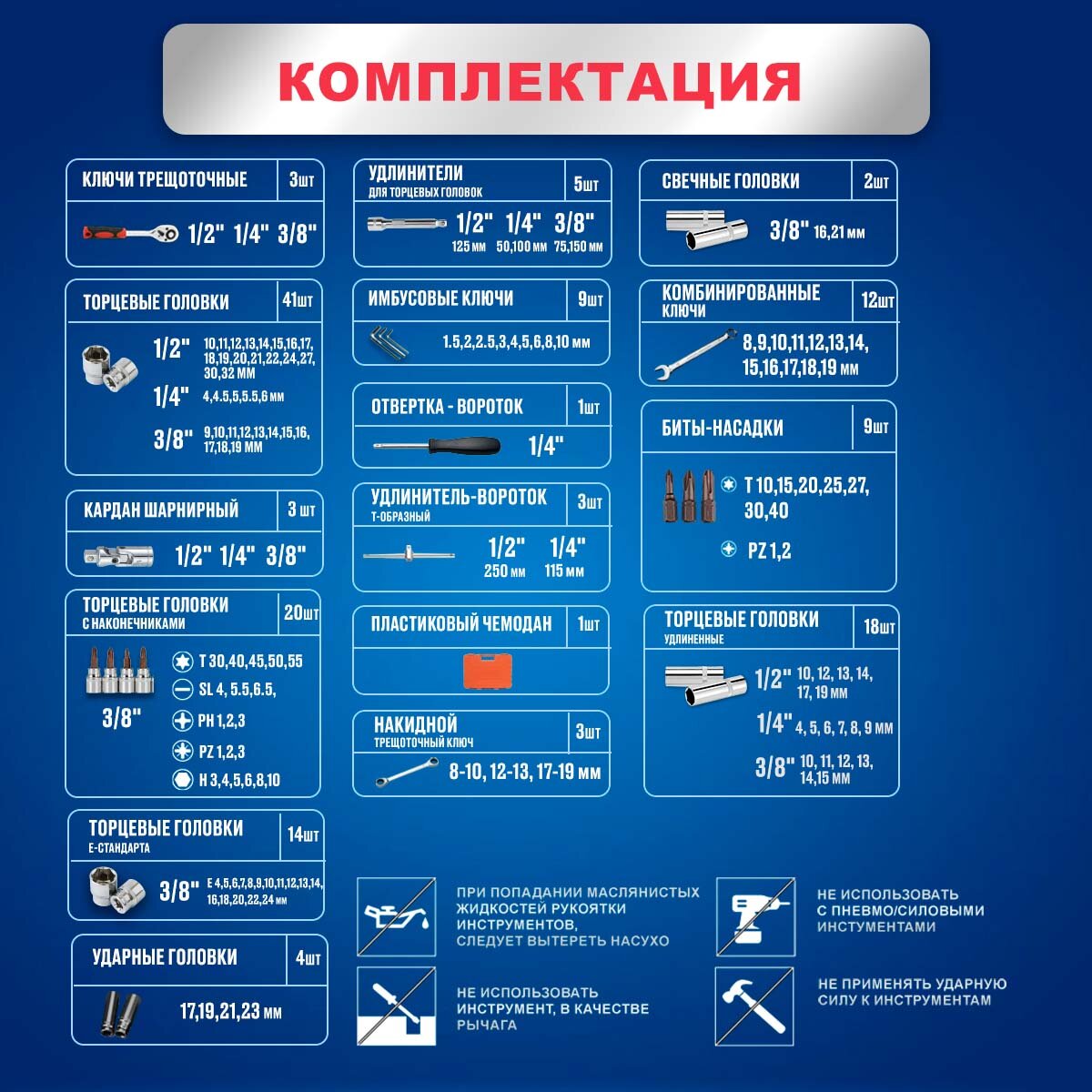 | Головки торцевые подробно | 6 шт. — 1/2" Удлиненные головки: 10、12、13、14、17、19 мм 6 шт. — 3/8" Удлиненные головки: 10、11、12、13、14、15 мм 2 шт. — 3/8" Головки свечные 16、21 мм 6 шт. — 1/4" Удлиненные головки: 4、5、6、7、8、9 мм 17 шт. — 1/2" Торцевая головка: 10、11、12、13、14、15、16、17、18、19、20、21、22、24、27、30、32 мм 11 шт. — 3/8" Торцевая головка: 9、10、11、12、13、14、15、16、17、18、19 мм 13 шт. — 1/4" Торцевая головка: 4、4.5、5、5.5、6、7、8、9、10、11、12、13、14、мм 1 шт. — 1/4" Торцевая головка 20 шт. — 3/8" Головки торцевые со вставкой ( плоские: 4、5.5、6.5;крестообразные PZ1 PZ2 PZ3;крестовые 1 2 3;шестигранники: 3、4、5、6、8、10;TORX T30、T40、T45、T50、T55 ) 14 шт. — Головки Е-профиль: 4、5、6、7、8、10、11、12、14、16、18、20、22、44 мм 4 шт. — Ударные головки: 17、19、21、23 мм |