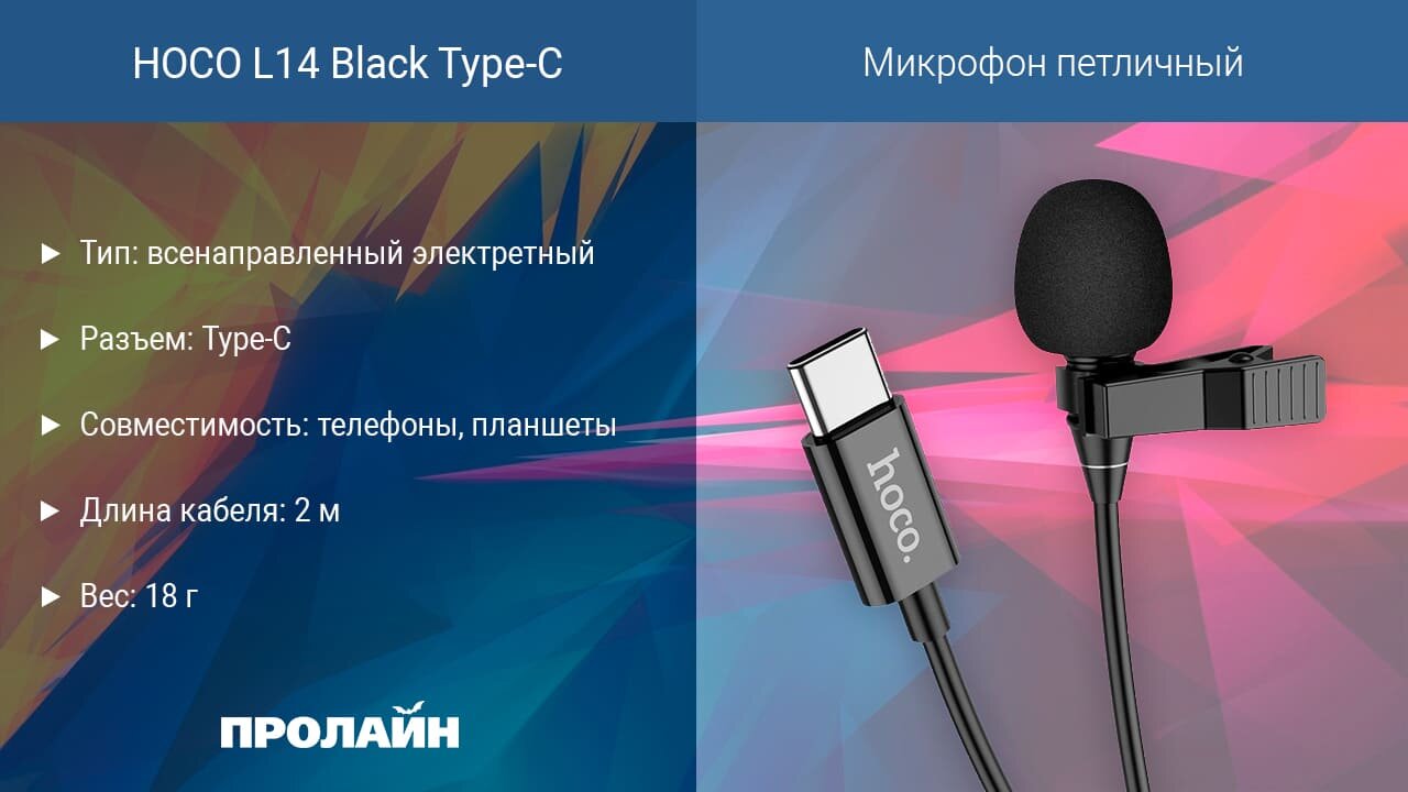 Микрофон Hoco L14 петличка/2м/Type-C черный