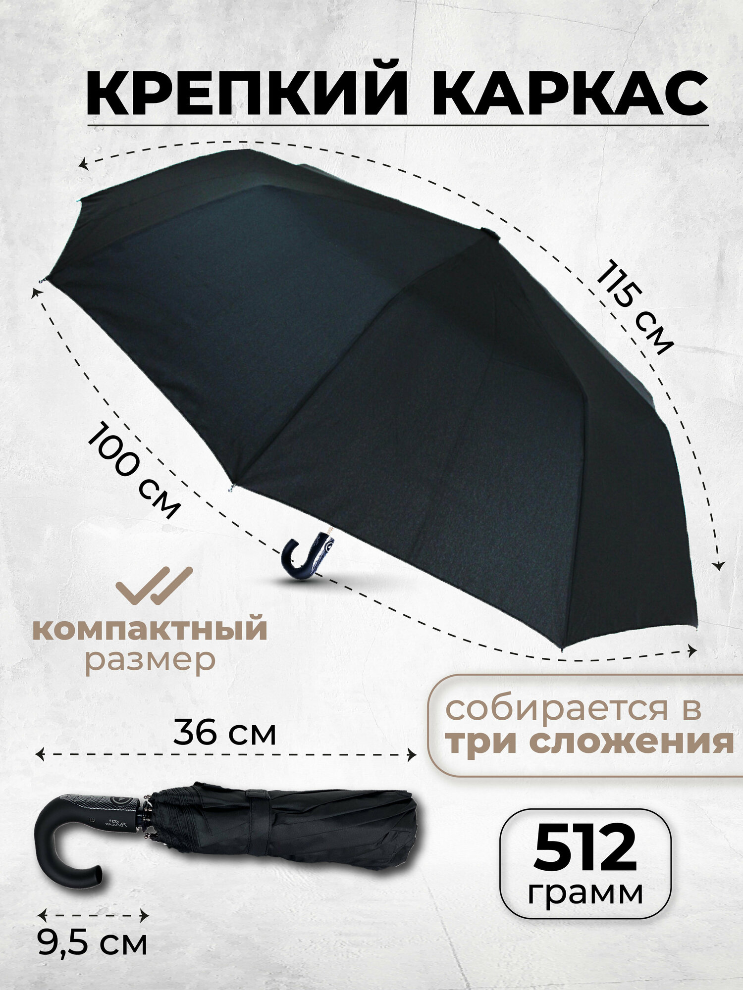 Мужской зонт складной 3 сложения, полуавтомат