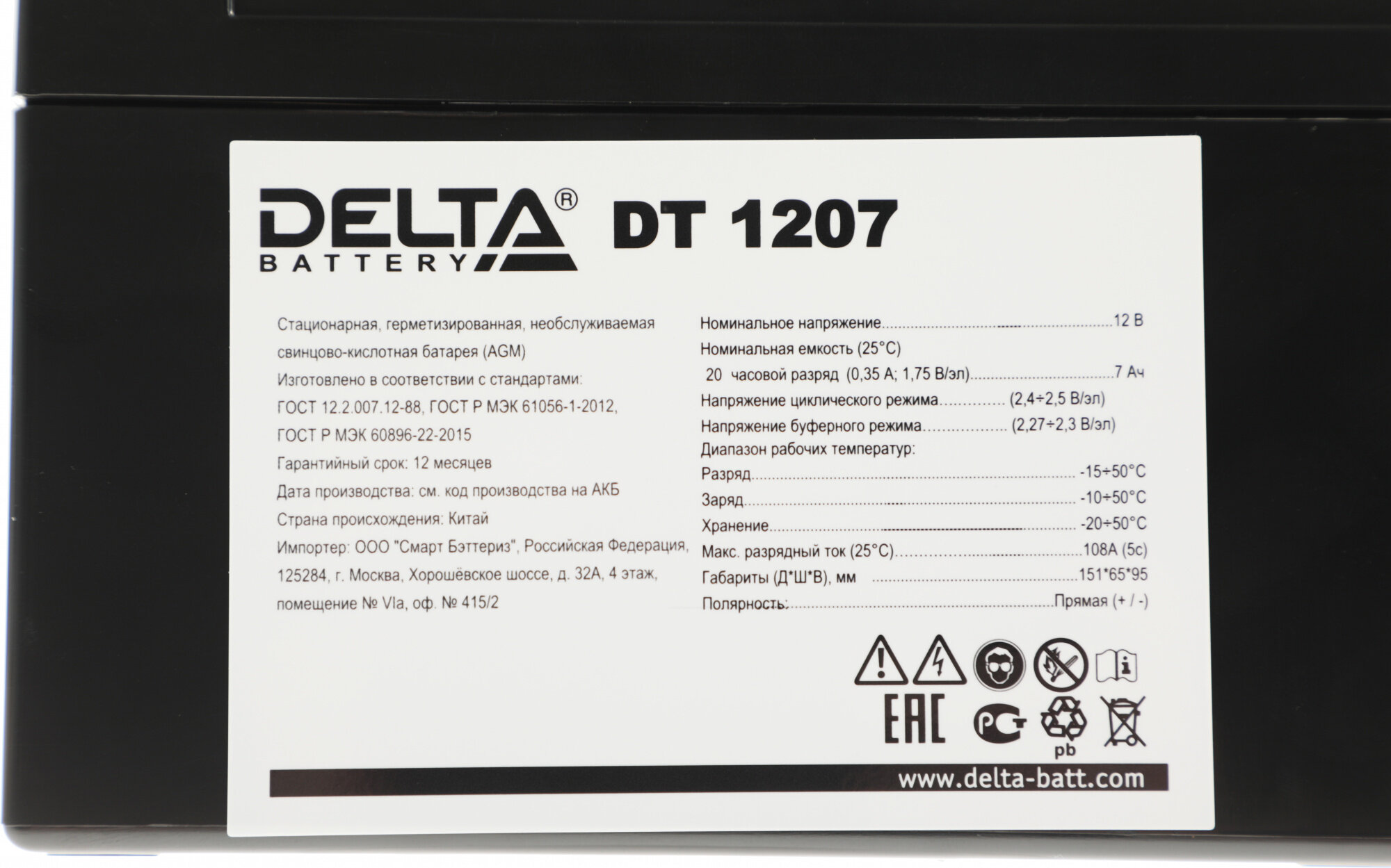 Аккумуляторная батарея DELTA для ИБП любых торговых марок, 12 В, 7 Ач, 151х65х95 мм, DT 1207