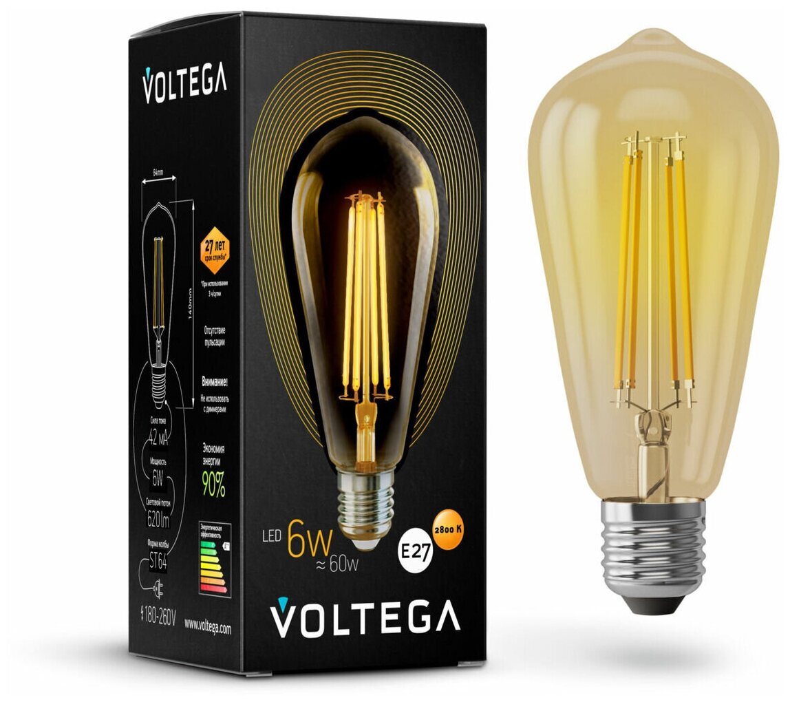 Лампа светодиодная Voltega 5526, E27, ST64, 6 Вт, 2800 К