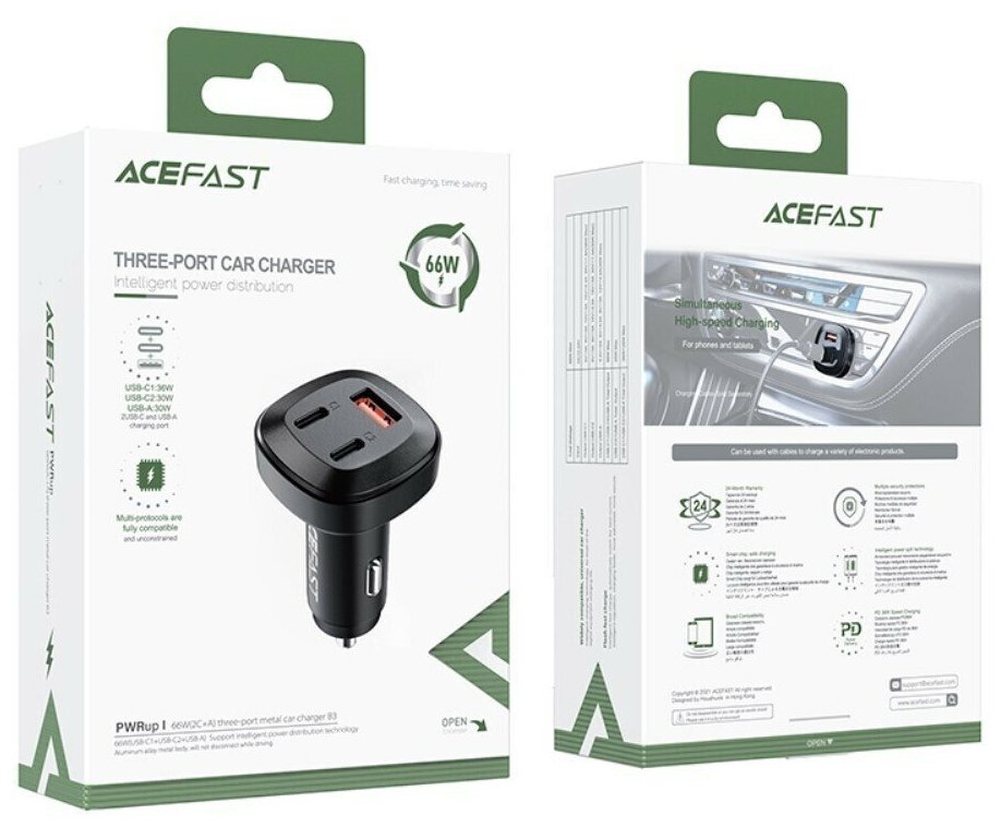 Автомобильное быстрое зарядное устройство ACEFAST B3 66W (USB-C+USB-C+USB-A) three-port, металлическое, с дисплеем, черный интересное: