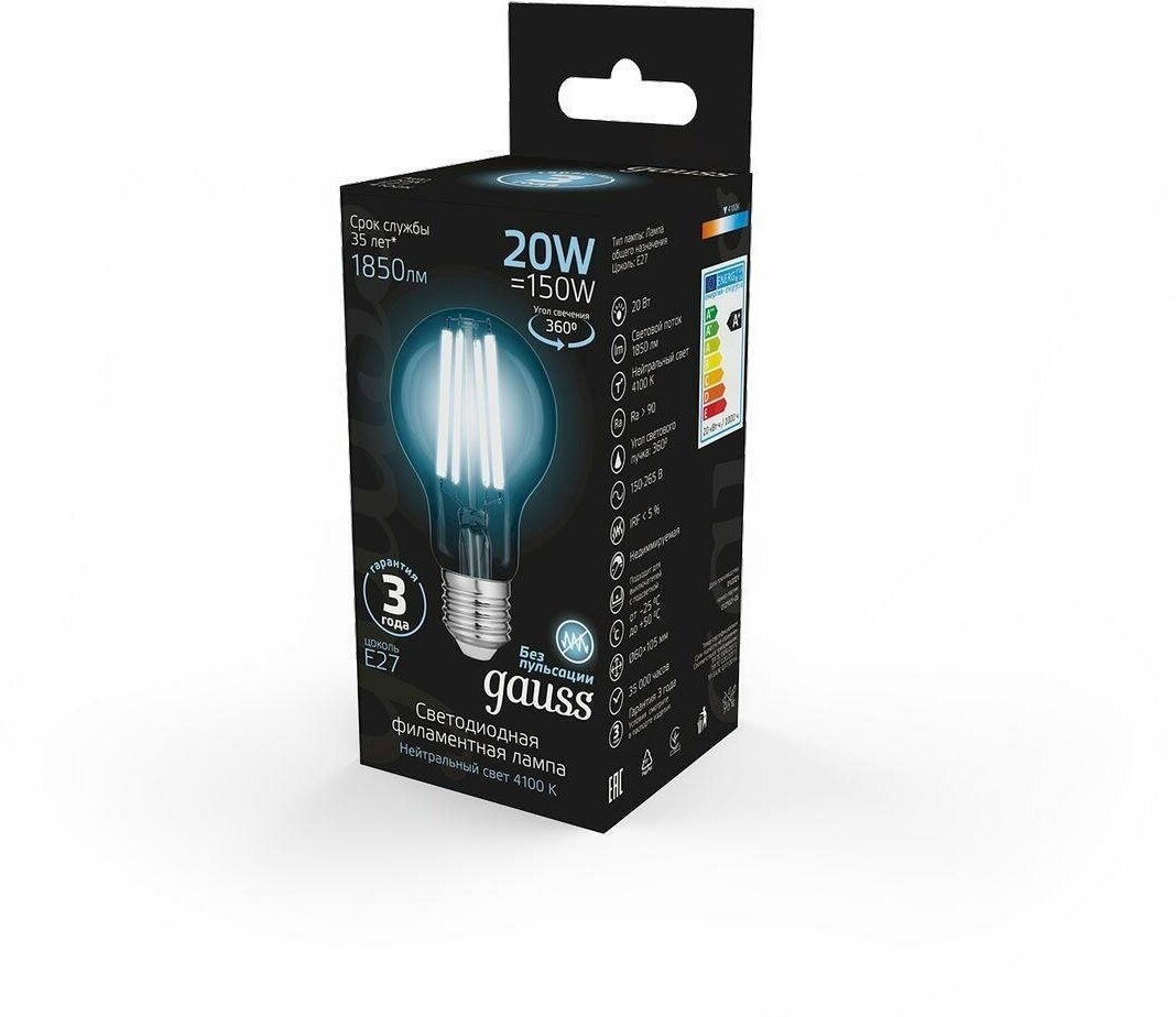 Лампа GAUSS Filament А60 20W 1850lm 4100К Е27 LED 1/10/40 102902220