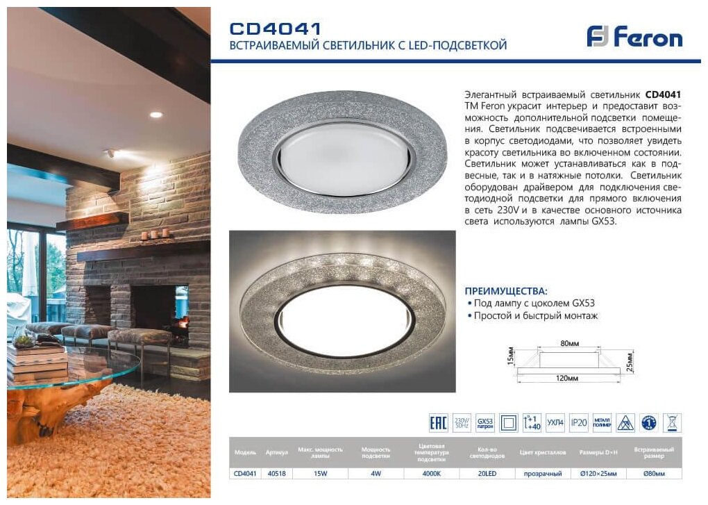 Светильник встраиваемый Feron ""CD4041" GX53 с подсветкой. Серебро+хром интересное: