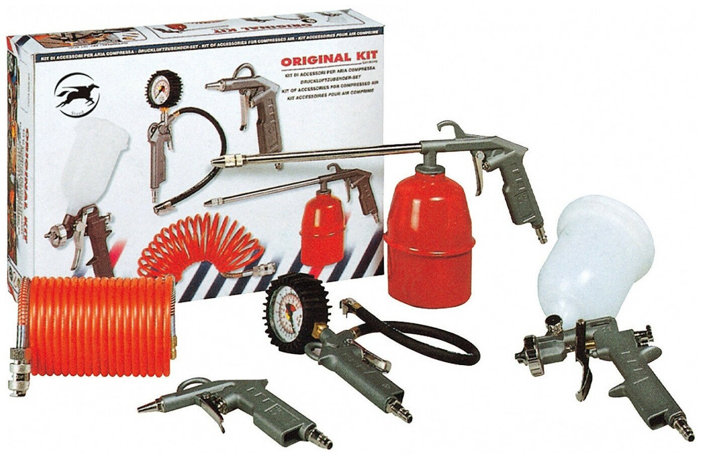| Комплектация | краскораспылитель с нижним бачком SGB1,5Q объемом 1 л., пистолет для подкачки шин с манометром TG35Q, моющий пистолет с регулируемым соплом WG1000Q, пистолет продувочный BG30Q, шланг спиральный SHQ6 5 м. |