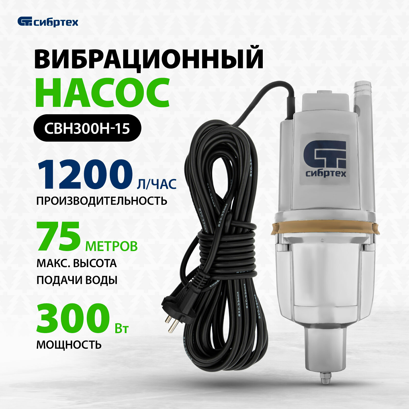 Вибрационный насос СВН300Н-15, нижний забор, 300 Вт, напор 75 м, 1200 л/ч, кабель 15 м// Сибртех 993 .