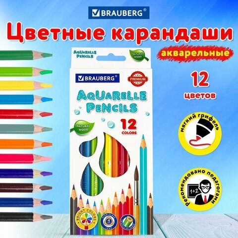 Карандаши цветные Brauberg акварельные, Premium aquarelle, 12 цветов, грифель мягкий, 4 мм (181671), 1 упак.