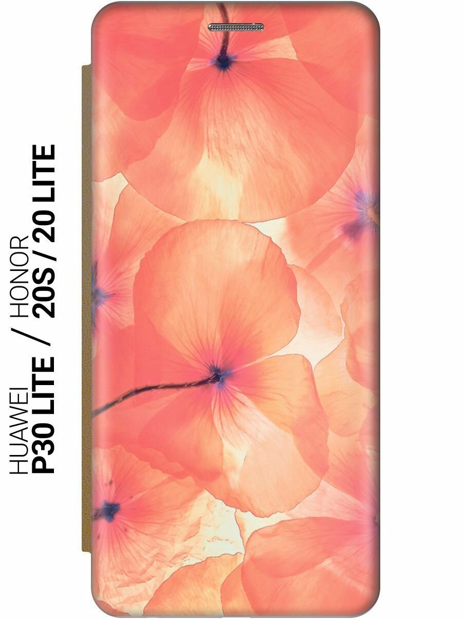 Чехол-книжка на Honor 20 Lite, 20s, Huawei P30 Lite, Хуавей П30 Лайт, Хонор 20 Лайт, 20s c принтом "Тюльпаны" золотистый