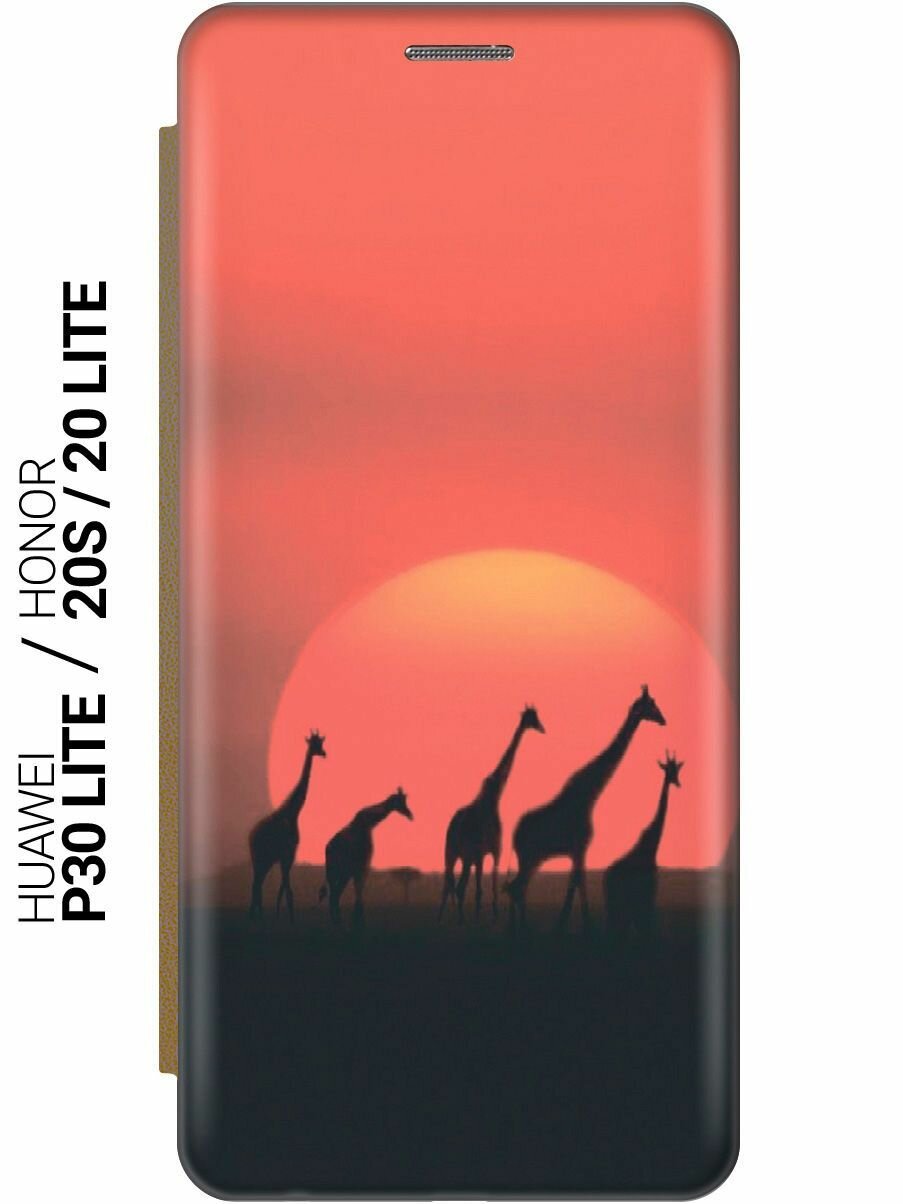 Чехол-книжка на Honor 20 Lite, 20s, Huawei P30 Lite, Хуавей П30 Лайт, Хонор 20 Лайт, 20s c принтом "Жирафы" золотистый