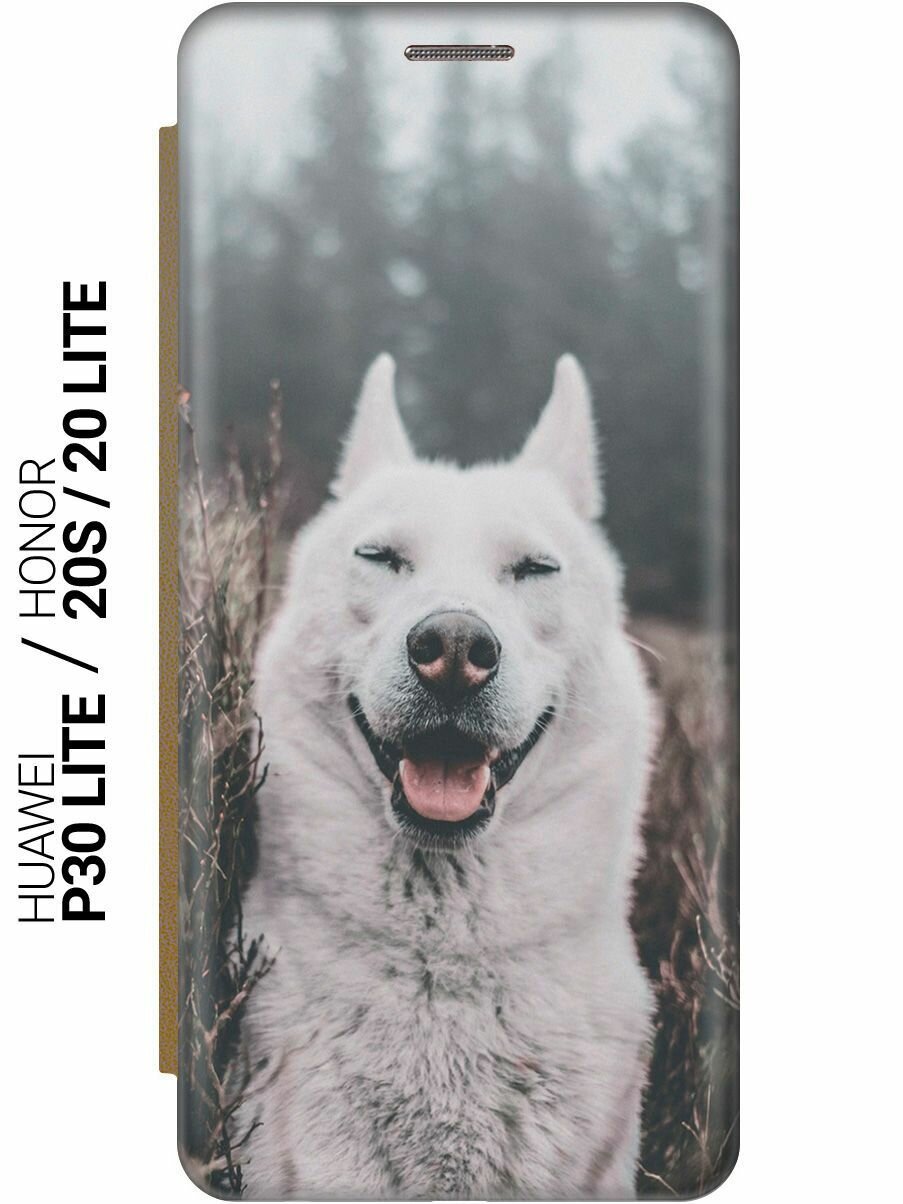 Чехол-книжка на Honor 20 Lite, 20s, Huawei P30 Lite, Хуавей П30 Лайт, Хонор 20 Лайт, 20s c принтом "Довольный пес" золотистый