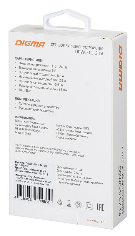 Сетевое зарядное устройство DIGMA DGWC-1U-2.1A-BK, черное, для планшетов и мобильных устройств интересное: