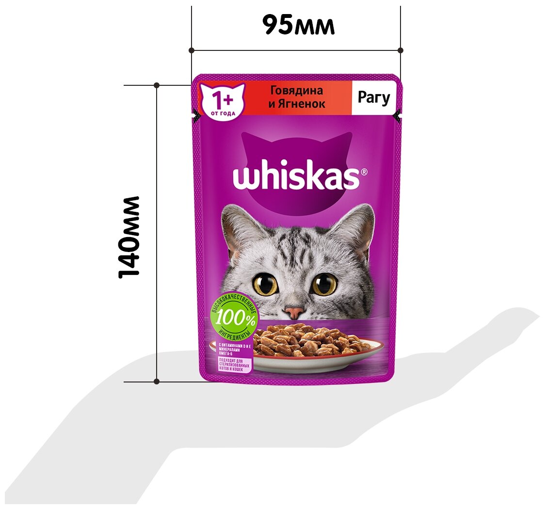 Корм влажный Whiskas полнорационный для взрослых кошек, рагу с говядиной и ягненком, 28шт х 75г