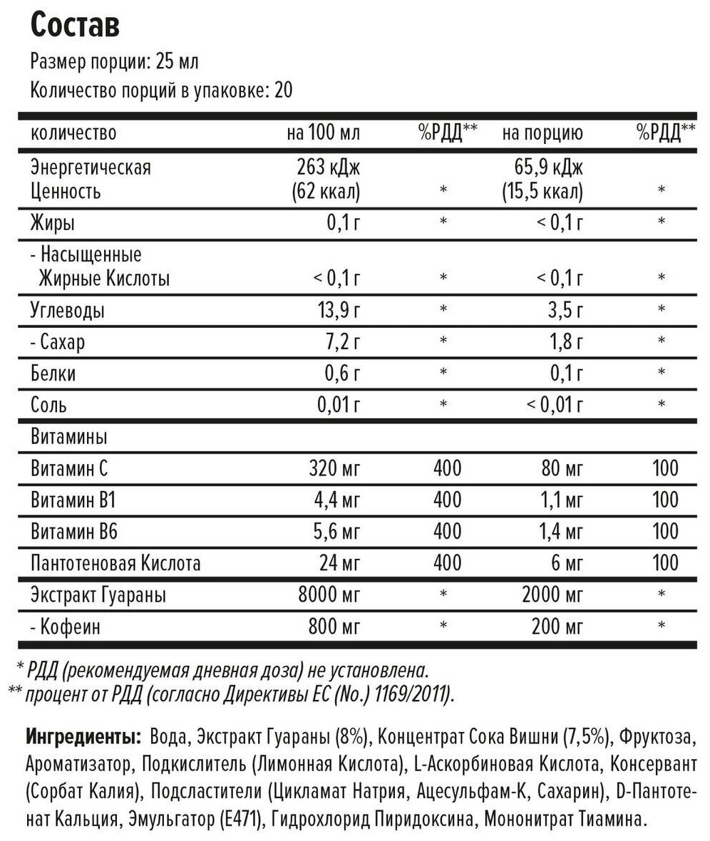 | Дополнительная информация | назначение: повышает выносливость и работоспособность; рекомендации по применению: принимать по одной порции (25 мл) в чистом виде или разбавить водой; состав: вода, экстракт гуараны, концентрат сока, фруктоза, ароматизатор, подкислитель (лимонная кислота), консервант (сорбат калия), подсластители (цикламат натрия, ацесульфам-к, сахарин), эмульгатор (E471), витамин C, пантотеновая кислота, витамин B6, витамин B1; содержание жиров в 100 г: 0.1 г; содержание белков в 100 г: 0.6 г; содержание углеводов в 100 г: 13.9 г; калорийность 100 г: 62 ккал |