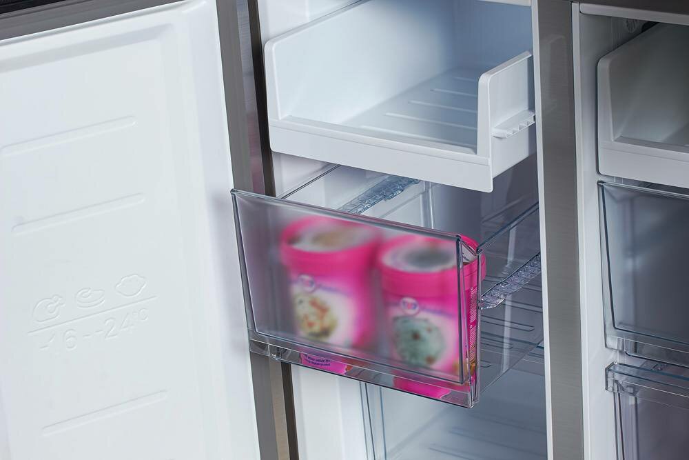 Материалы выполнены качественно, ничего не скрипит, не шатается, не воняет. В холодильной камере места достаточно, но не прям так много, чтобы пустовали полки, но больше, чем в обычном холодильнике, теперь нам на двоих хватает сполна. Когда мы покупали ягоды в ящиках ставили их вместе с ними и места хватало ещё поставить что-то рядом. Для кого-то минус, что ящик для овощей идёт одним длинным ящиком, поэтому открыть одну дверцу и достать что-то из него, не получится, но для меня это вообще не проблема, тк холодильник я брала специально с двумя дверьми, чтобы их открывать обе одновременно, а сам ящик вдвигается легко. Так что, кто на чем концентрируется. ? Двери можно открывать одновременно, с небольшим усилием, видимо очень хорошие магнитные уплотнители, можно по одной, но левую посложнее открывать, чем правую, тк на левой специальная защитная пластина, которая закрывает щель между дверцами. Дисплей на дверце. Можно менять температуру в холодильнике от минимума, до супер холодного. Также и в морозильнике, жалко только, что нельзя поменять температуру в разных камерах морозилки на разную, только одинаковая температура для обеих морозилок от минимальной до супер холодной. Супер холодный ставлю, когда надо заморозить ягоды на зиму, например. Морозит реально хорошо и быстро. Две отдельные морозильные камеры, в каждом отделении сверху открытая полочка, посередине глубокий выдвигающийся ящик 35см, снизу глубокий скошенный ящик до 28 см сверху. Впечатления в общем отличные, мне холодильник очень нравится, посмотрим, что будет дальше, как покажет себя через несколько лет. |
