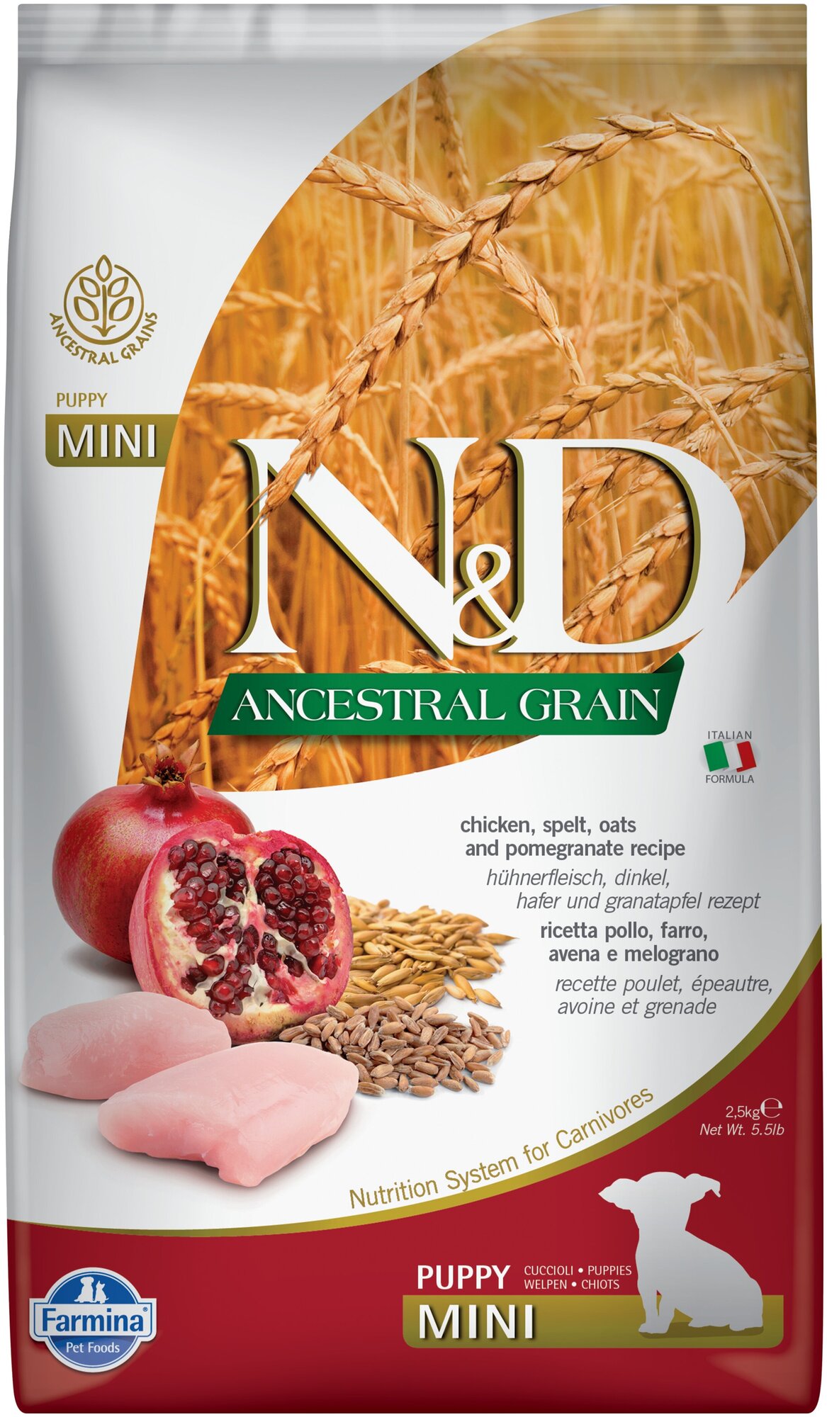 Сухой корм Farmina N&D Ancestral Grain Chicken & Pomegranate Puppy Mini, для щенков маленьких пород, низкозерновой, курица и гранат, 2,5 кг