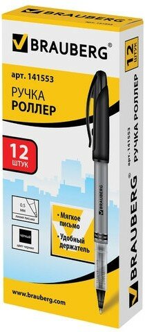 Ручка-роллер BRAUBERG "Control", черная, корпус серебристый, узел 0,5 мм, линия письма 0,3 мм, 141553 Комплект - 12 шт .