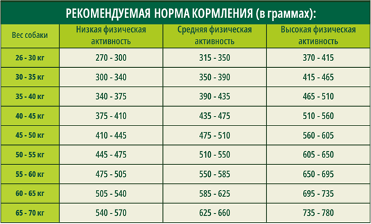 | Дозировка | вес собаки 5-10 кг, суточная норма 90-155 г; вес собаки 10-15 кг, суточная норма 155-210 г; вес собаки 15-20 кг, суточная норма 210-260 г; вес собаки 20-30 кг, суточная норма 260-350 г; вес собаки 30-40 кг, суточная норма 350-430 г; вес собаки 40-50 кг, суточная норма 430-510 г. |