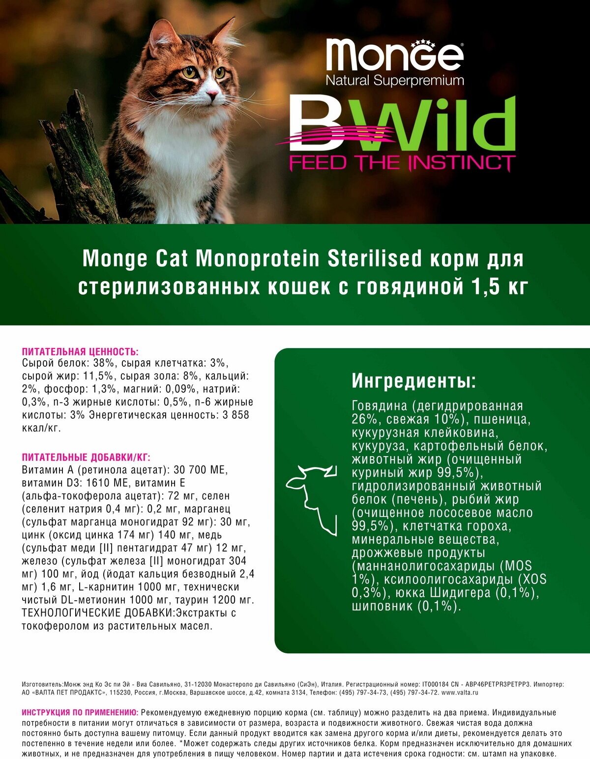 | Состав | говядина (дегидрированная 26%, свежая 10%), пшеница, кукурузная клейковина, кукуруза, картофельный белок, животный жир (очищенный куриный жир 99,5%), гидролизированный животный белок (печень), рыбий жир (очищенное лососевое масло 99,5%), клетчатка гороха, минеральные вещества, дрожжевые продукты (маннанолигосахариды (МОS 1%), ксилоолигосахариды (XOS 0,3%), юкка Шидигера (0,1%), шиповник (0,1%) |