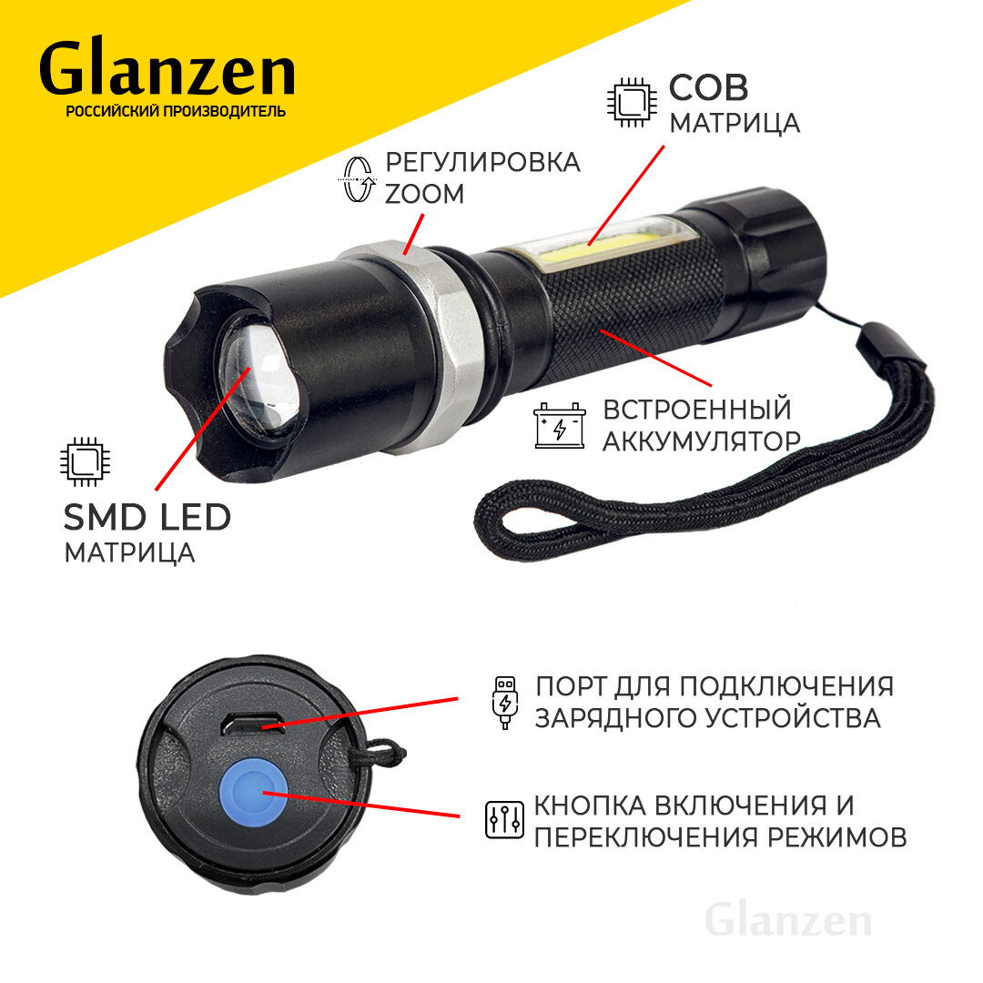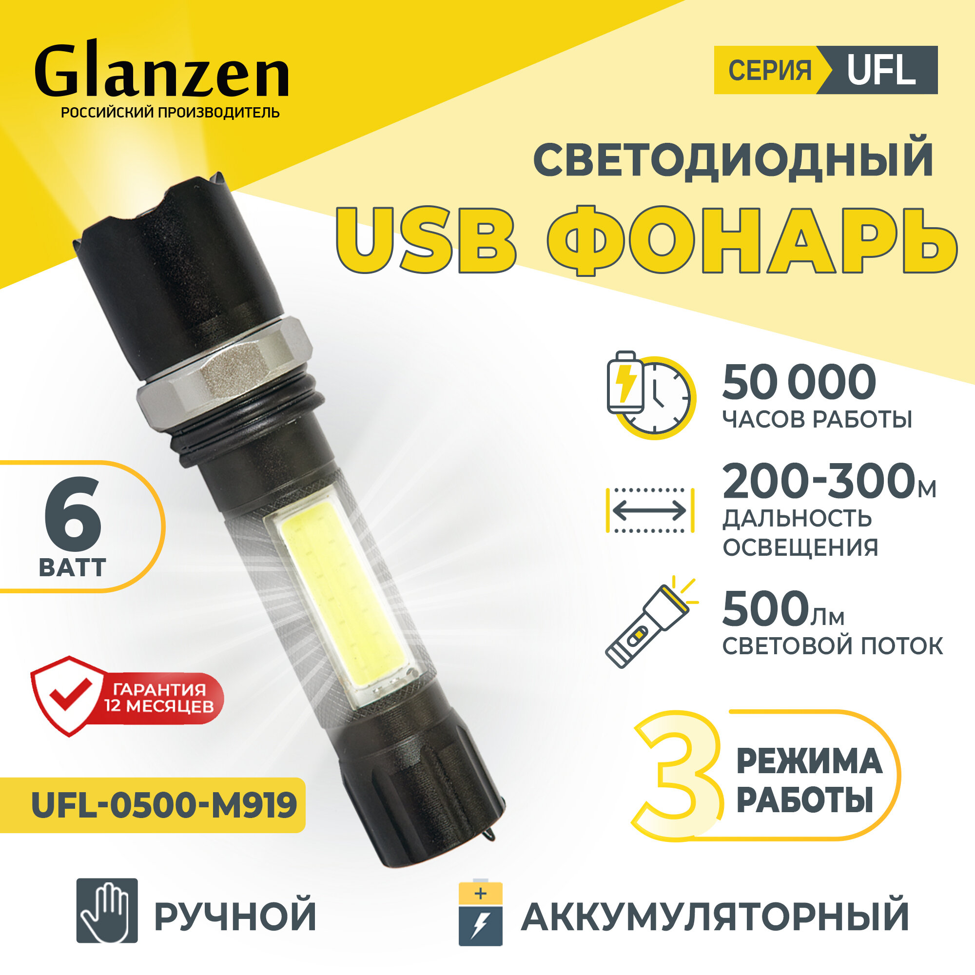 Фонарь GLANZEN UFL-0500-M919 светодиодный, аккумуляторный, usb