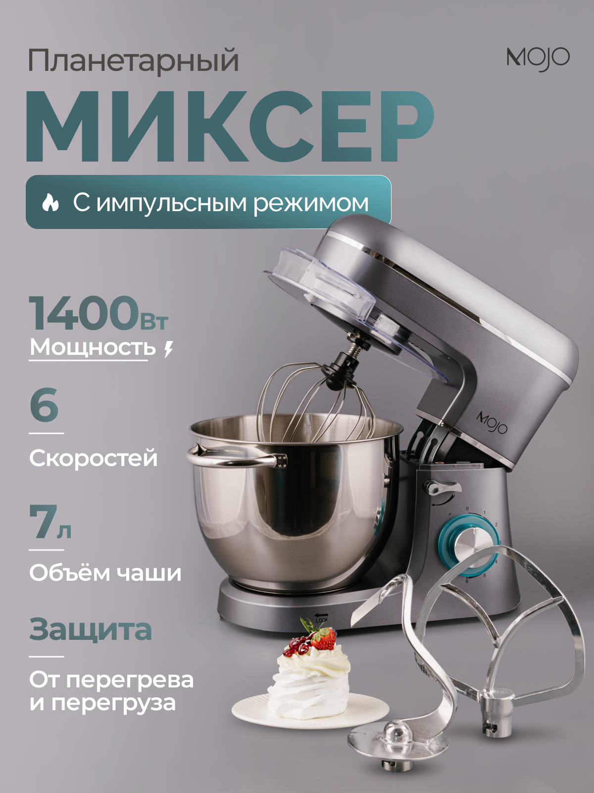 Миксер планетарный MOJO SM-445, объём чаши 7 литров, 1400 Вт, 6 скоростей, импульсный режим