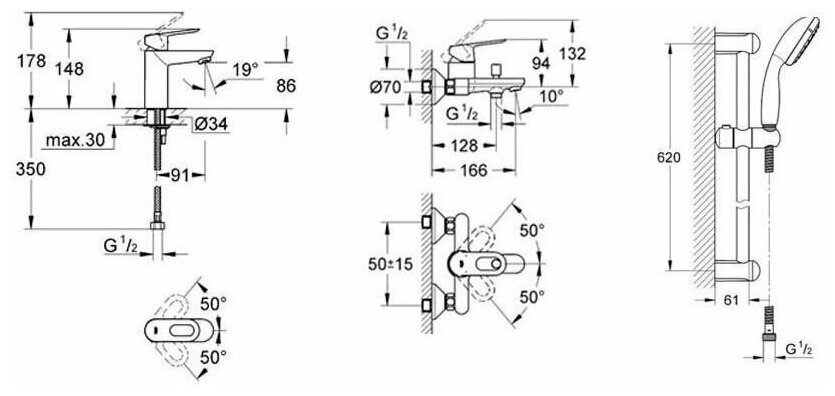 | Дополнительная информация | комплект включает смеситель для умывальника, смеситель для ванны и душа; высота стойки для душа: 620 мм; диаметр душевой лейки: 100 мм |