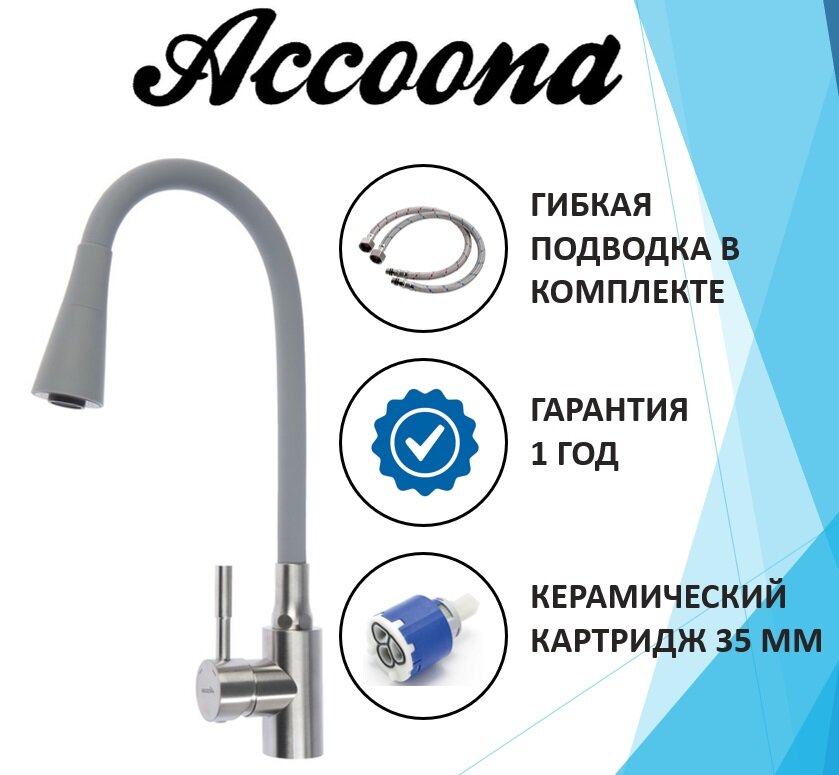 Смеситель Accoona A9890T-3, для кухни, однорычажный, картридж 35мм, силиконовый излив, серый