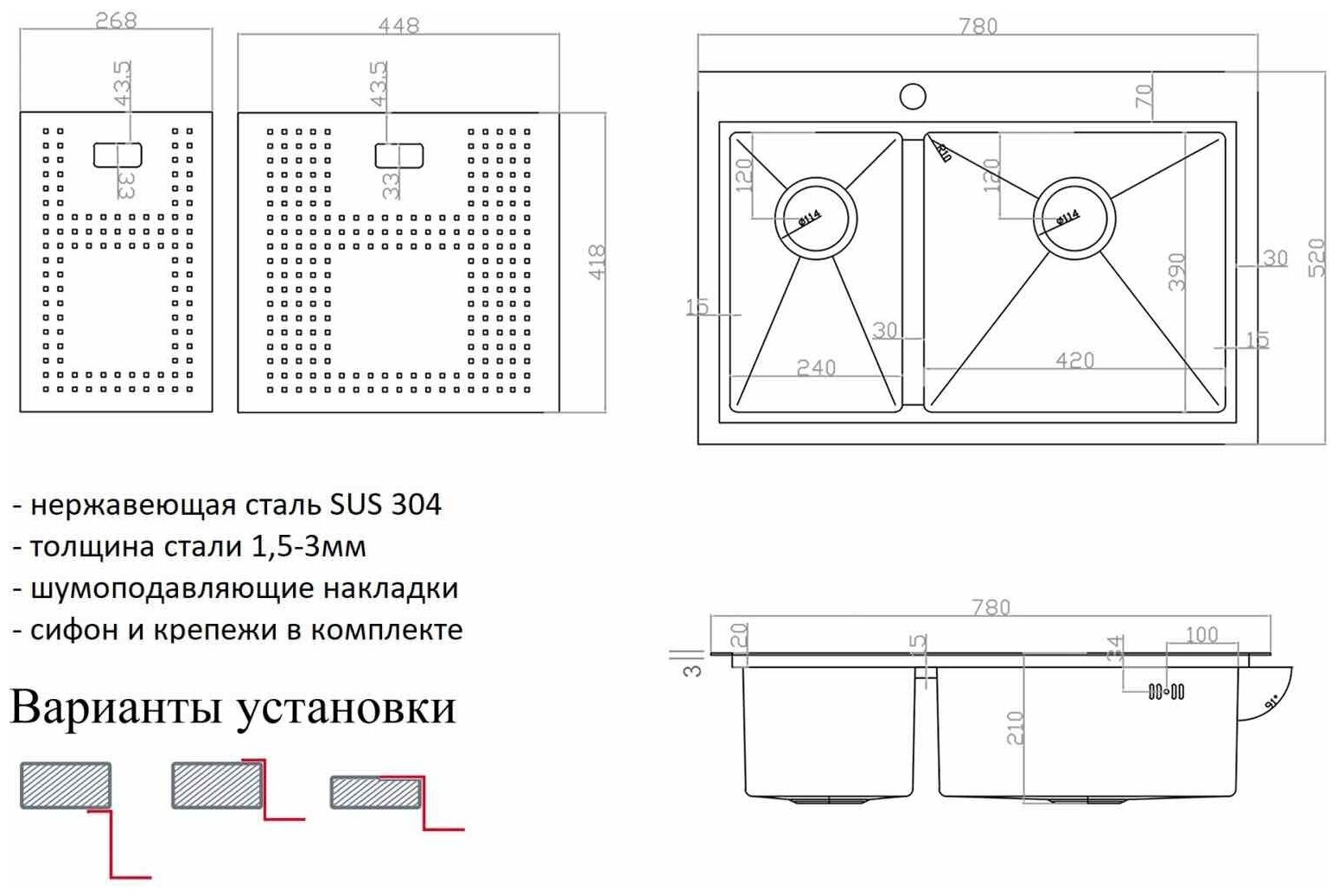 Мойка кухонная ZorG Master N ZM N-78-2-52-R из нержавеющей стали с накладкой, сталь