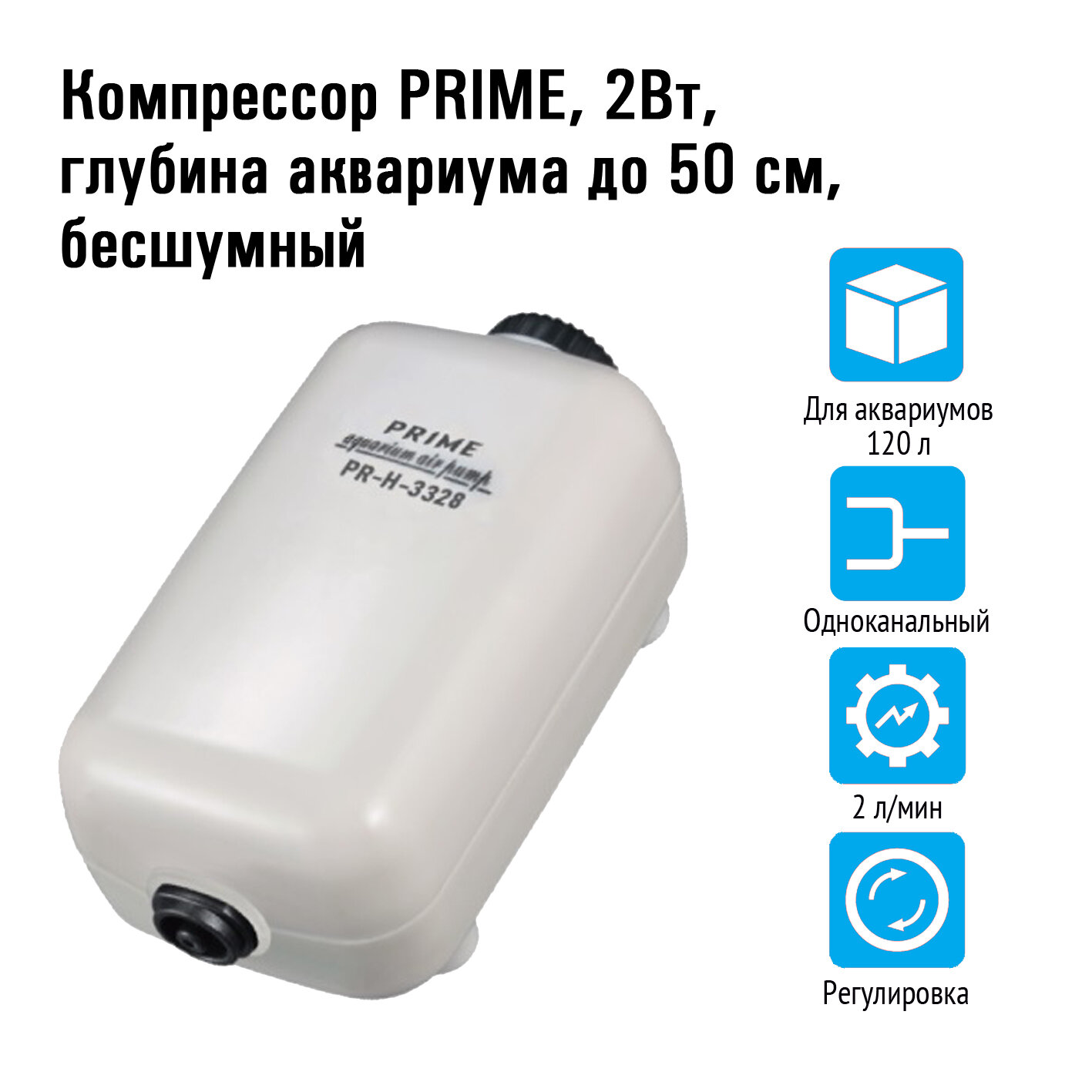 Компрессор PRIME PR-H-3328 регулируемый, 2 Вт, 2 л/мин, для аквариумов глубиной до 50 см, бесшумный (1 шт)