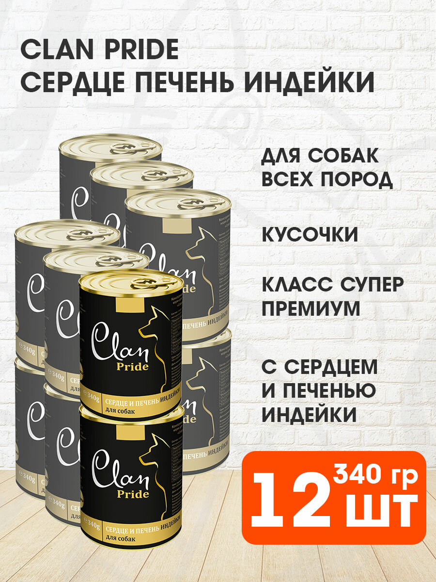 Влажный корм для собак CLAN Pride, сердце, печень индейки 1 уп. х 12 шт. х 340 г