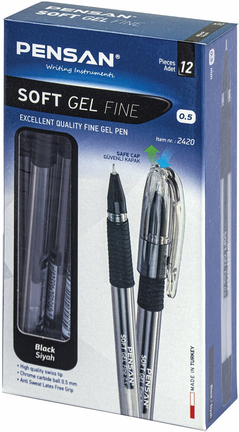Ручка гелевая с грипом PENSAN Soft Gel Fine, черная, игольчатый узел 0,5 мм, линия 0,4 мм, (12 шт.)