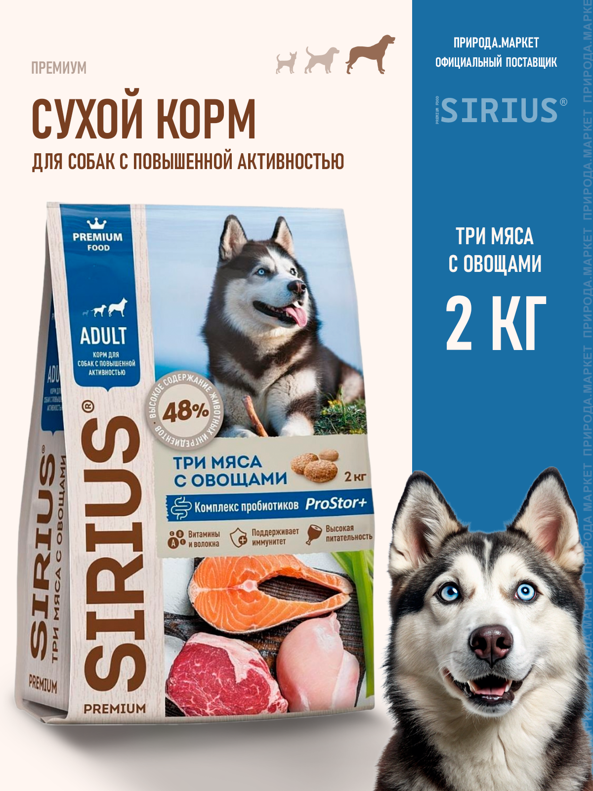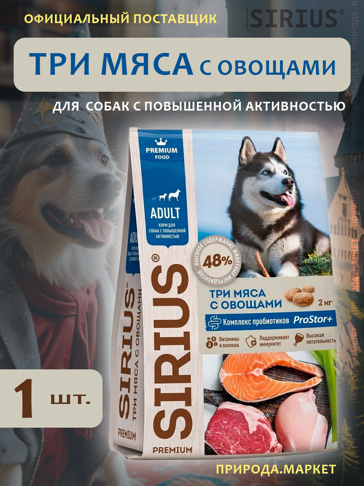 Сухой корм SIRIUS PREMIUM, Сириус для собак с повышенной активностью, три мяса с овощами, 2 кг