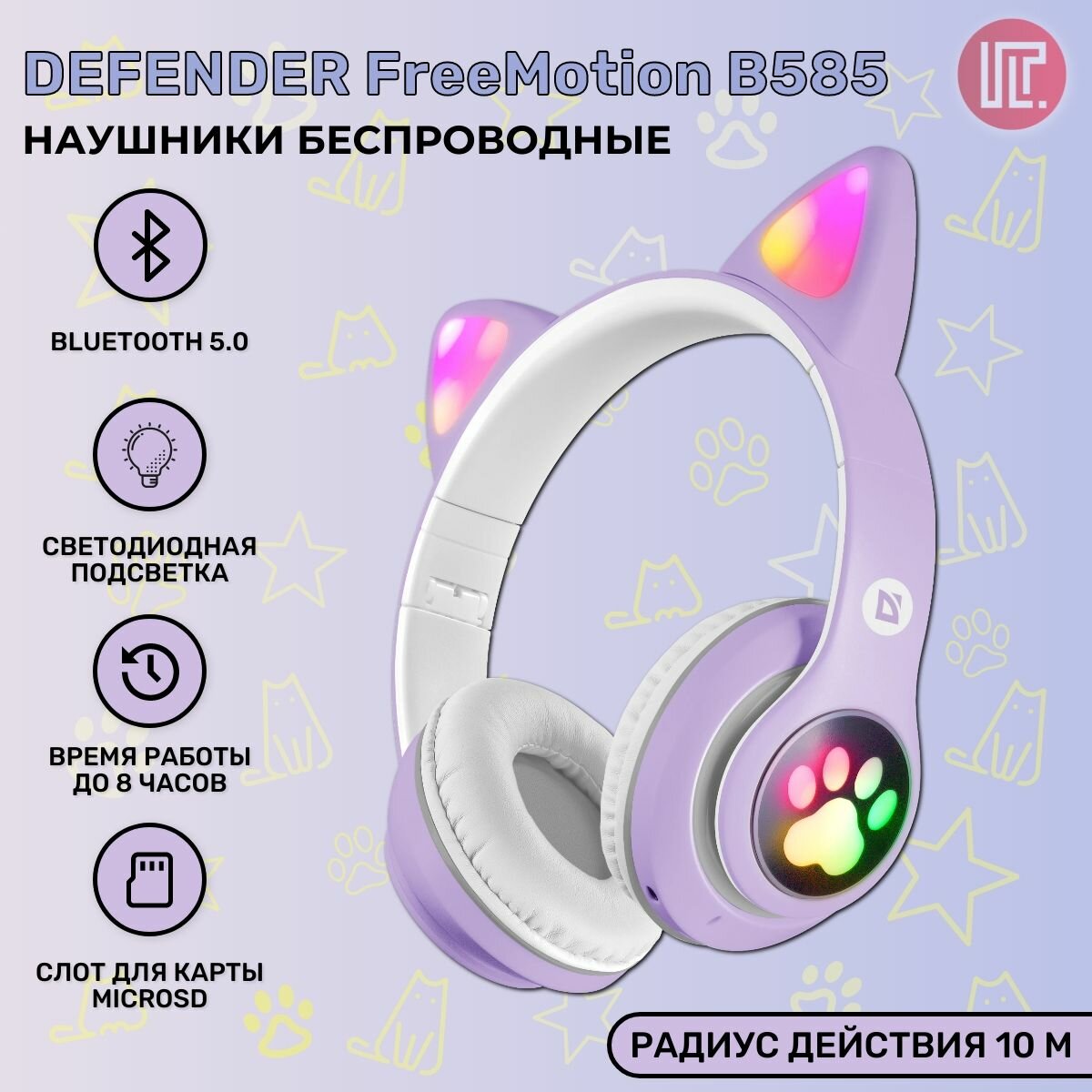 СохранитьНаушники беспроводные накладные Defender FreeMotion 585, Bluetooth 5.0 + microSD + MP3 плеер, сиреневый, LED подсветка интересное: