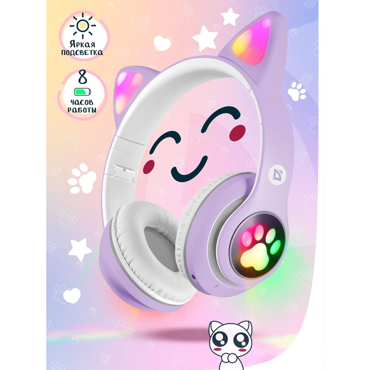 Наушники беспроводные накладные Defender FreeMotion 585, Bluetooth 5.0 + microSD + MP3 плеер + FM радио, сиреневый, LED подсветка