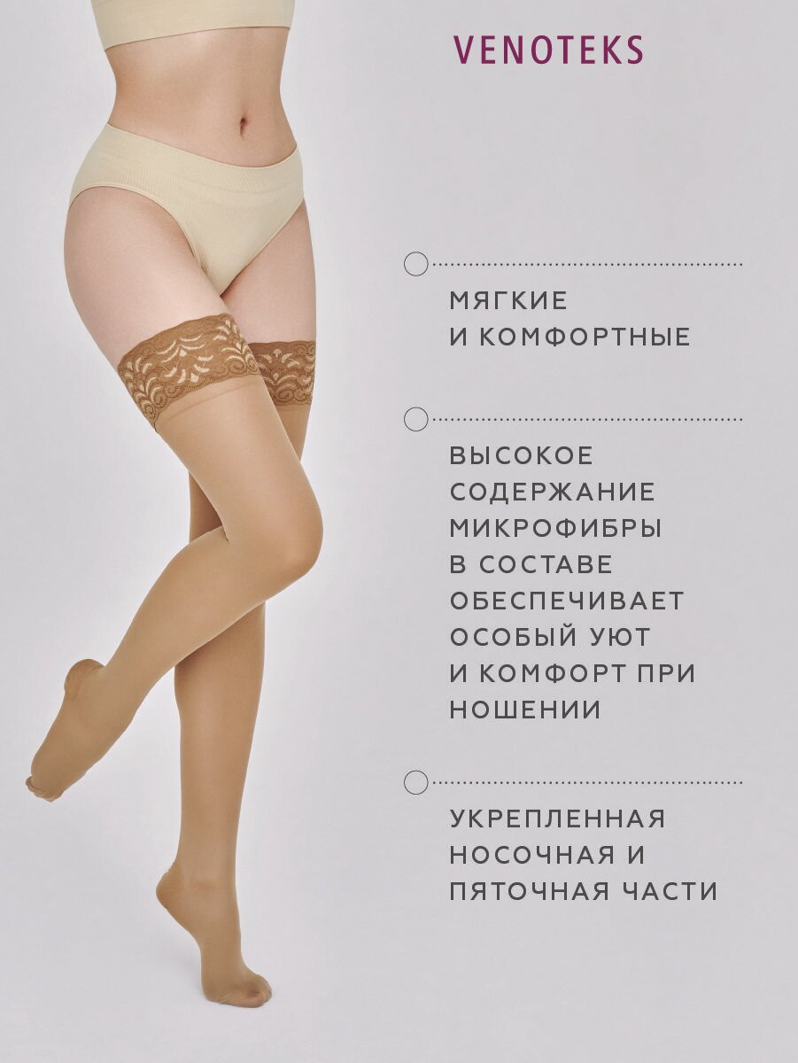 Компрессионные чулки с микрофиброй VENOTEKS Comfort 2C202, 2 класс, широкая ажурная резинка, Размер XL, Бежевый