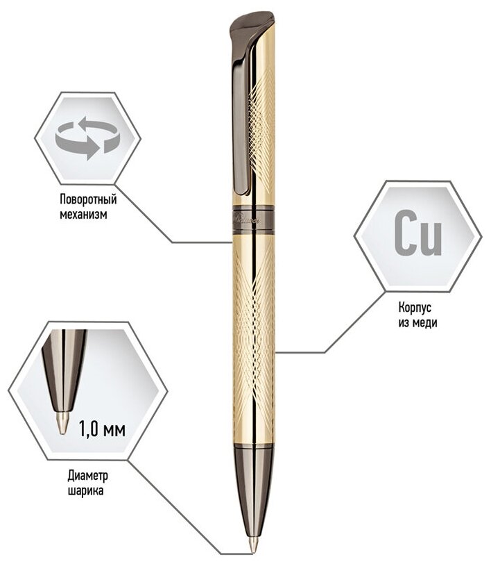 | Дополнительная информация | Длина письма 1000 Толщина линии 0,7 Код сменного стержня 209328 Наличие штрихкода на ед. товара есть Отделка корпуса никелирование Футляр кожаный Диаметр пишущего узла 1,0 Цвет корпуса золотой Цвет чернил синий Материал корпуса медь Цвет декоративных элементов оружейный металл Клип медь Вид товара ручка шариковая Морозоустойчивость нет Форма корпуса круглая Механизм поворотный |