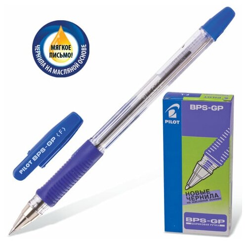 Ручка шариковая масляная с грипом PILOT "BPS-GP", синяя, корпус прозрачный, узел 0,7 мм, линия письма 0,21 мм, BPS-GP-F, BРS-GP-F - 12 шт.