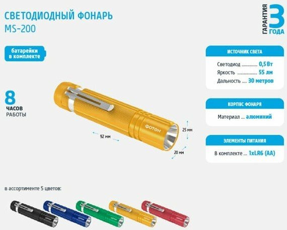 Ниже Вы можете прочитать отзывы на Фотон Фонарь светодиодный MS-200 0,5W, 1хLR6 в комплекте, золотой 23444, ознакомится с подробными характеристиками, посмотреть интересные обзоры и фотографии на Фотон Фонарь светодиодный MS-200 0,5W, 1хLR6 в комплекте, золотой 23444.