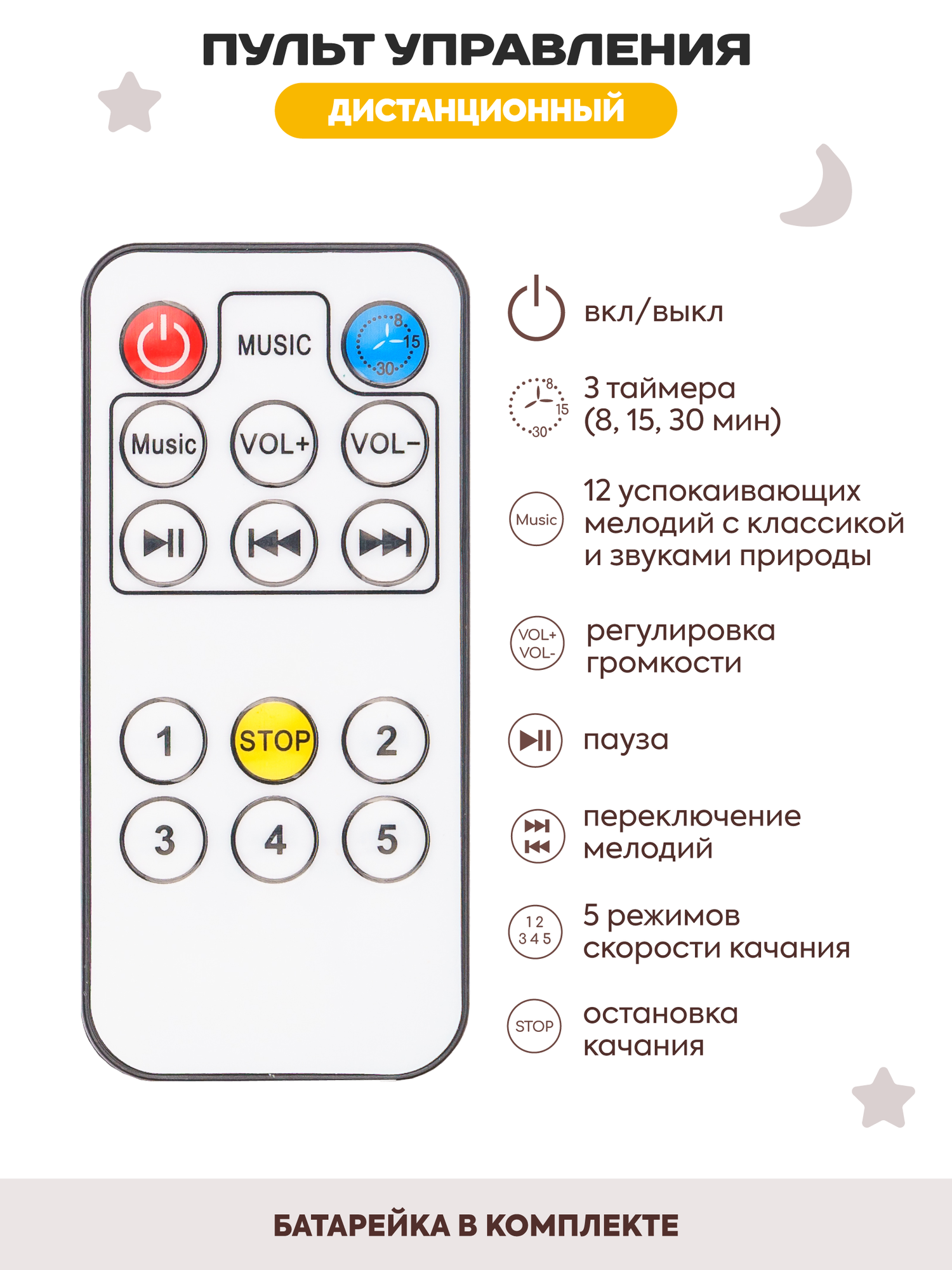 | Особенности | пульт ДУ / работа от батареек / таймер музыки / таймер укачивания |