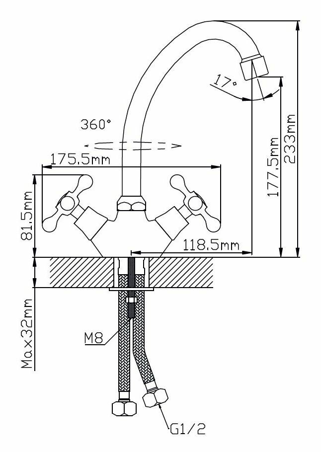 Смеситель д/кухни, 2-ручк, керам к/б, хром, поворот излив, крепл шпилька, Potato (Китай), P4365