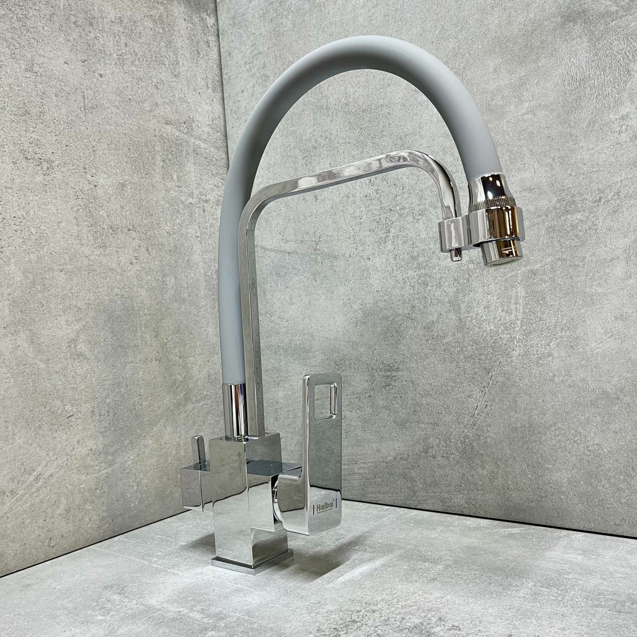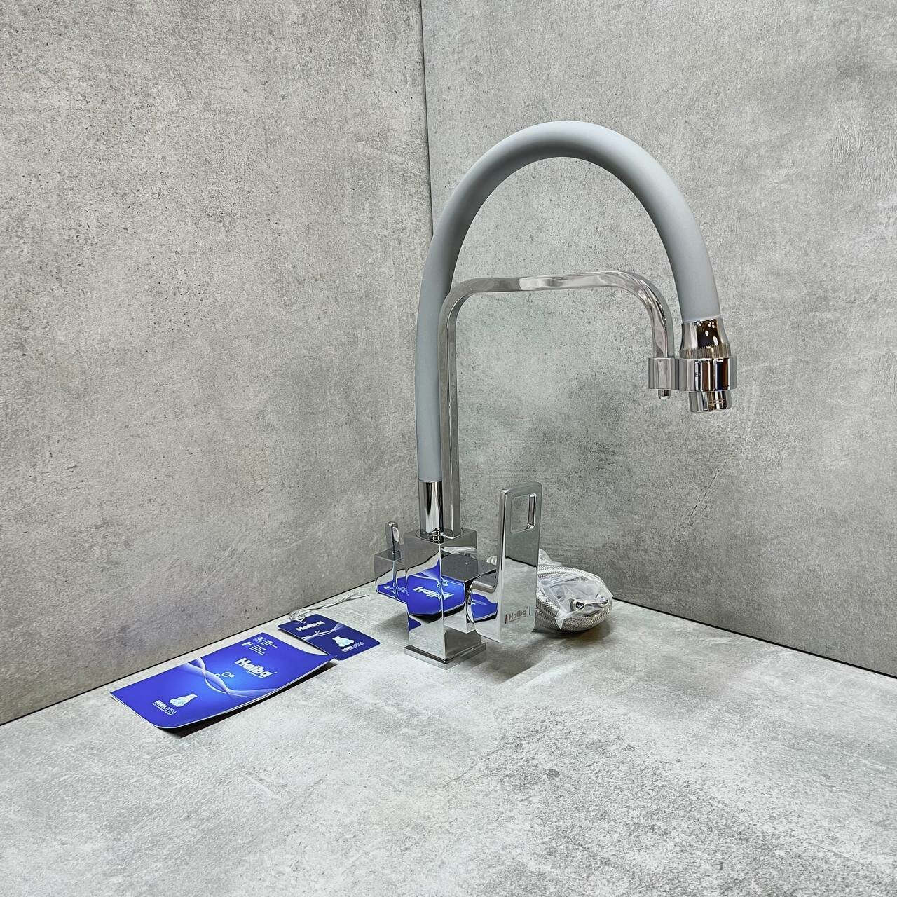 Купить Смеситель для кухни HAIBA с гибким силиконовым поворотным изливом, с подключением фильтра питьевой воды, с корпусом из латуни, держатель излива, цвет хром/серый, монокомандный, аэратор, универсальный