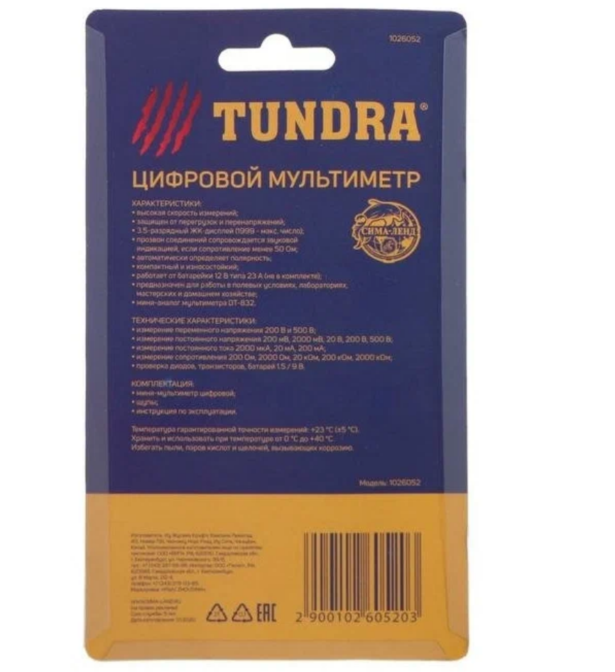 Мультиметр тундра mini, DT-182, ACV/DCV, DCA, 200-200MΩ, проверка батареек 44682 и 9V